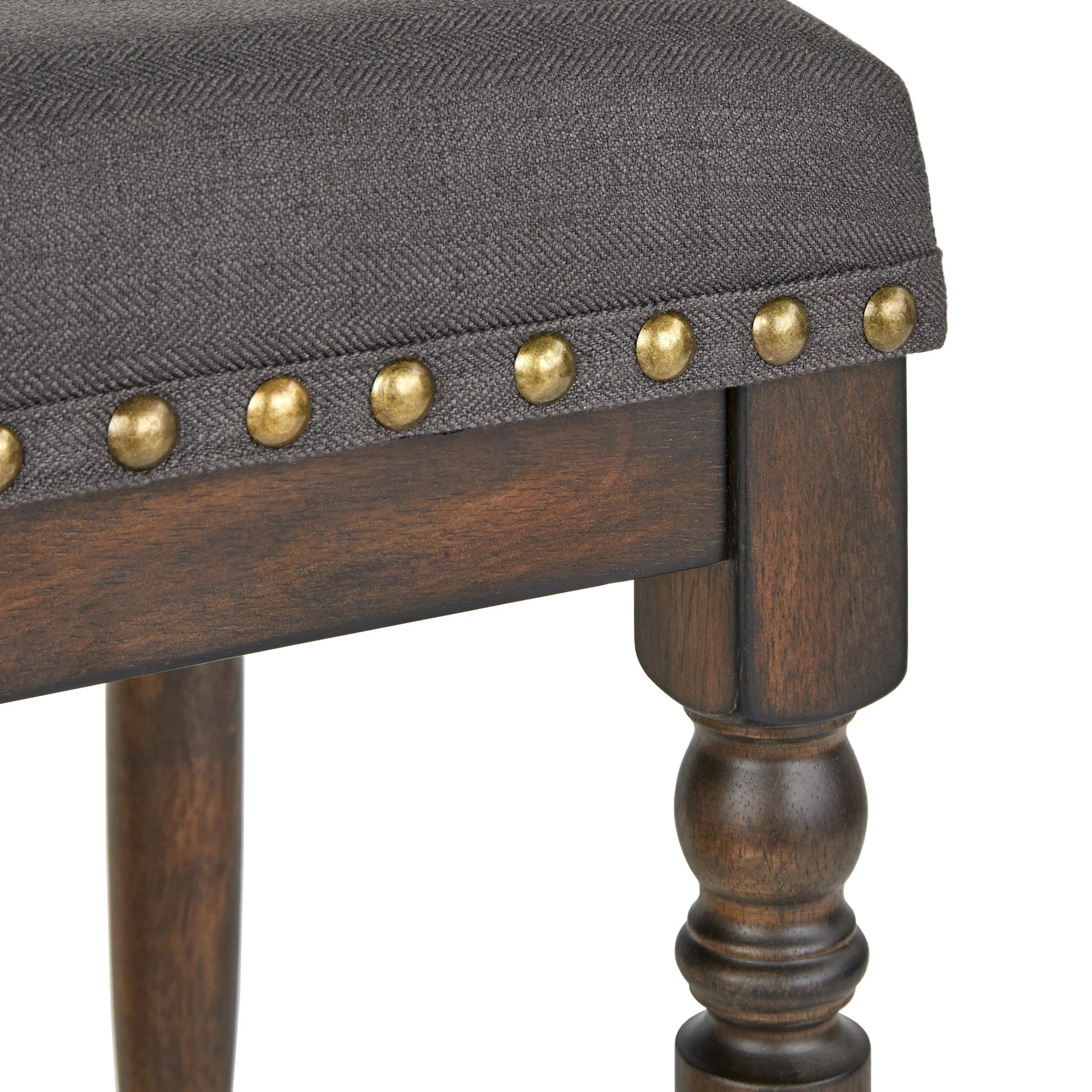 This set of two bar stools offers an old-world style with a balance of comfort and classic design. Perfect for everyday use or entertaining guests, these bar-height stools add warmth and charm to any space. Upholstered in neutral charcoal gray linen-look herringbone fabric, they feature traditionally crafted solid rubberwood legs with a rustic brown finish. The stools have cushioned foam seats for comfort and brass nail head trim for an elegant detail. With a seat height of 31.5 inches, they fit most bar or pub tables.