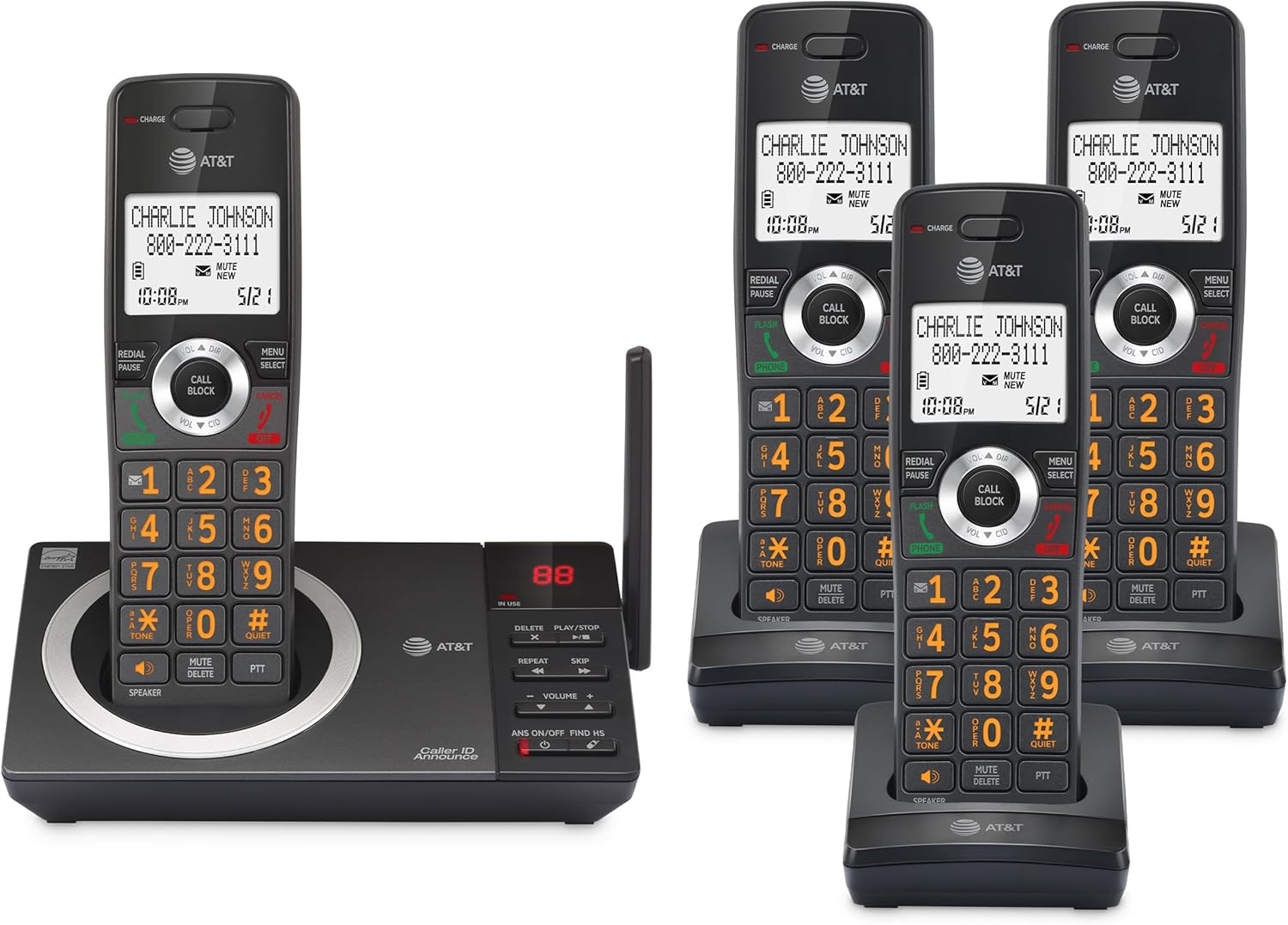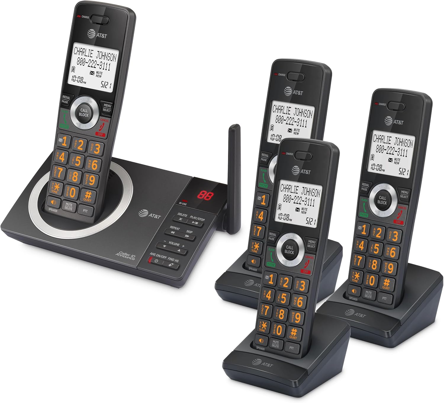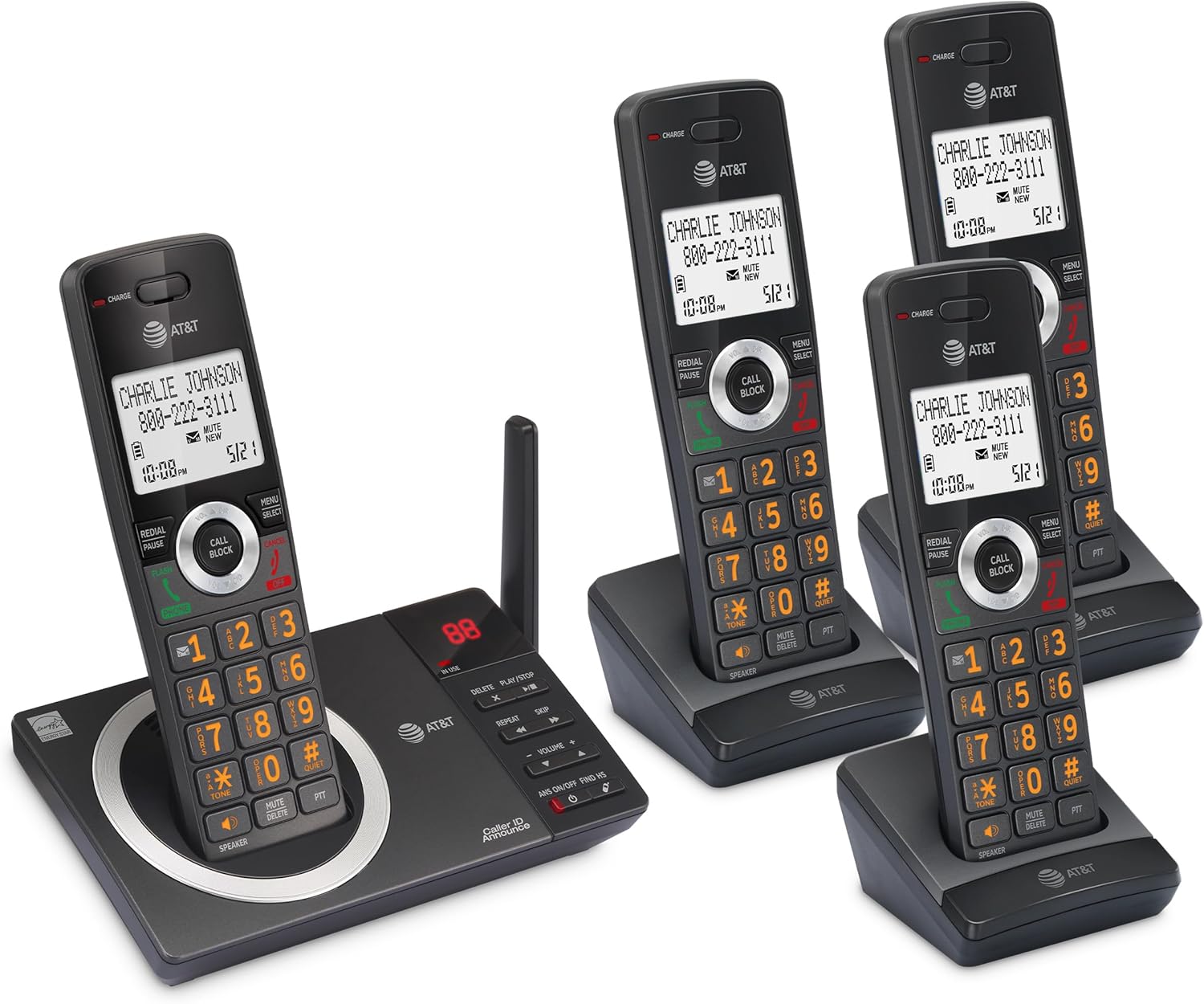 AT&T 4-Handset DECT 6.0 Expandable Cordless Home Phone with Large Display, Big Buttons, Answering Machine, Smart Call Blocker, Bluetooth Connect to Cell, Long Range, Caller ID, Speakerphone: DL72419