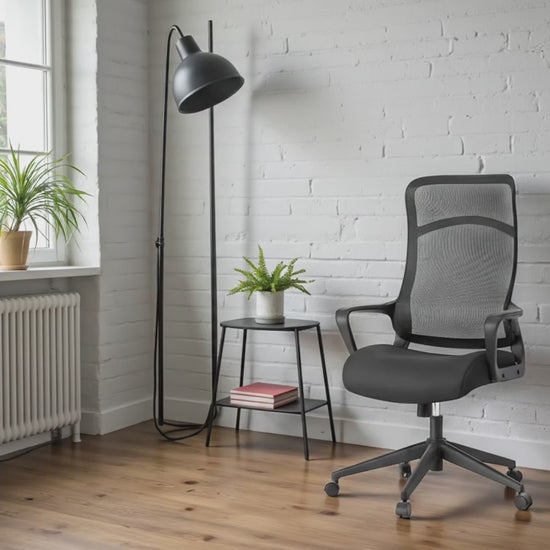 Featuring a cozy upholstered seat cushion and a breathable mesh back, this chair ensures all-day comfort. The adjustable height allows you to customize your seating position, while the five-wheel base provides smooth mobility across your workspace. Fixed armrests add extra support for a comfortable working experience.