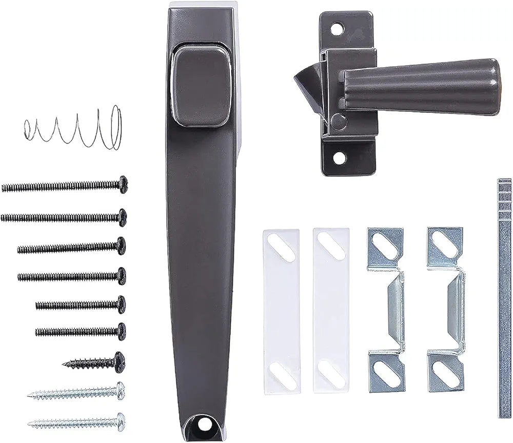 This generic push button tie-down handle is designed for storm and screen doors, providing secure closure and smooth push-button operation. Finished in Florida bronze, it offers corrosion resistance and a clean, decorative appearance suitable for outdoor use. Ideal for residential doors, this handle ensures durability, reliability, and easy installation on compatible door systems.