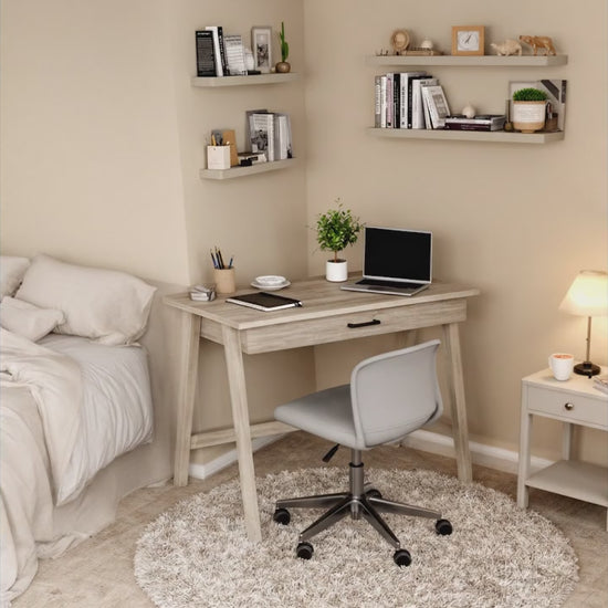 The Paulo Wood Writing Desk with Drawer in Weathered White from Threshold is a sleek and functional addition to any home office, bedroom, or study space. Featuring a weathered white laminate surface and durable metal hardware, this desk blends modern style with practicality, providing both elegance and long-lasting performance.