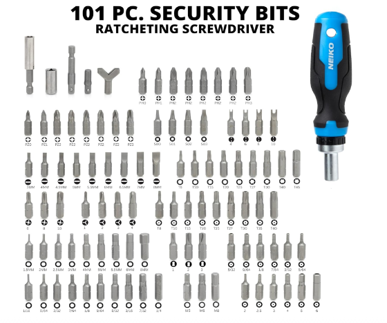 This 101-piece security bit set with ratcheting screwdriver is designed for professional and DIY repair tasks that require versatility and precision. Made from durable chrome vanadium steel, the bits offer strength, wear resistance, and long-lasting performance.