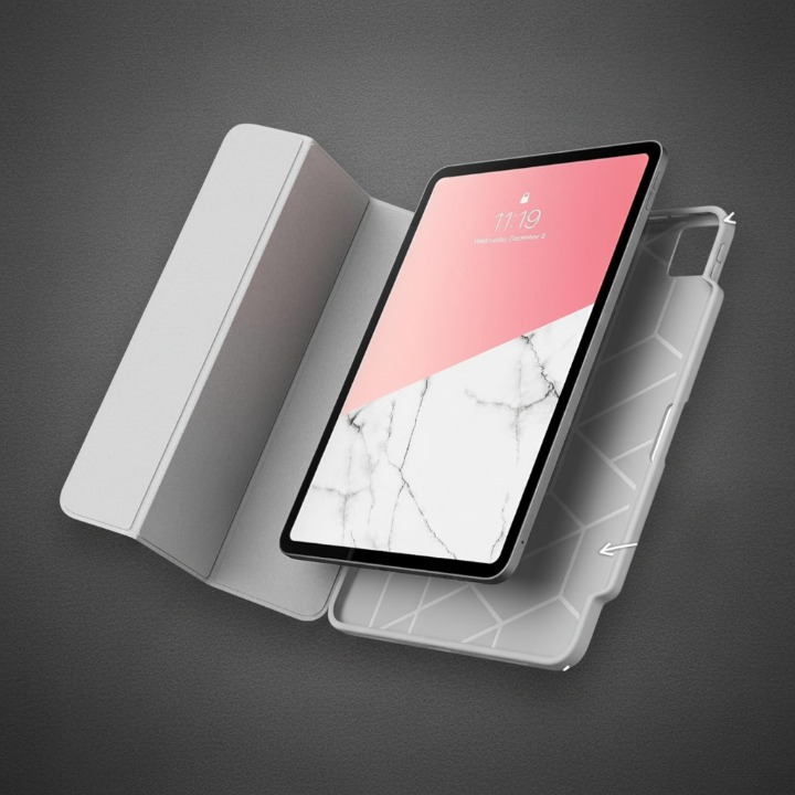 The trifold front cover folds into a convenient stand for hands-free viewing, typing, or reading, while the smart auto sleep/wake function helps preserve battery life. Crafted with a durable PU exterior, soft microfiber lining, and flexible TPU back, this case delivers full-body protection against drops, scratches, and everyday wear. Precise cutouts ensure seamless access to all buttons, ports, and cameras.